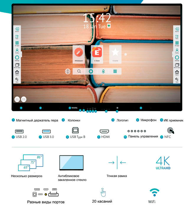 Используя встроенную технологию Wi-Fi, серия IFX предоставляет приложение Eshare- многоэкранный интерактивный инструмент для совместного использования экрана.