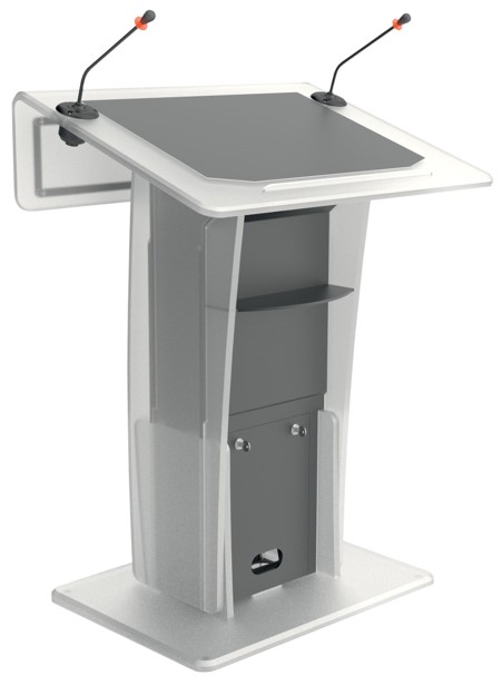 Кафедра оснащается двумя разъемами для микрофонов. Рабочая поверхность позволит разместить большинство типов бумажных документов, книг и брошюр.