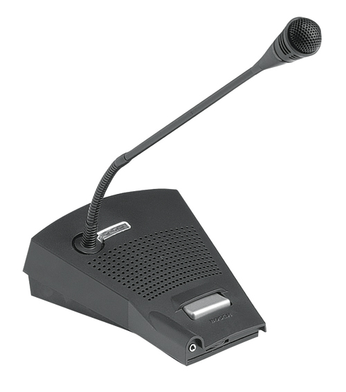 Вызывная базовая станция для объявлений LBB 4430 00 требуется для передачи голосовых объявлений или включения заранее записанных аудио данных в нужных зонах, подключенных к системе оповещения. Данная базовая станция включает в себя микрофон на гибкой ножке, кнопку его активации и специальный разъем для подключения гарнитуры.