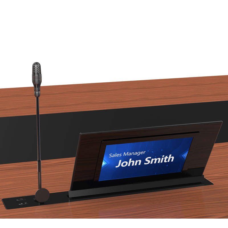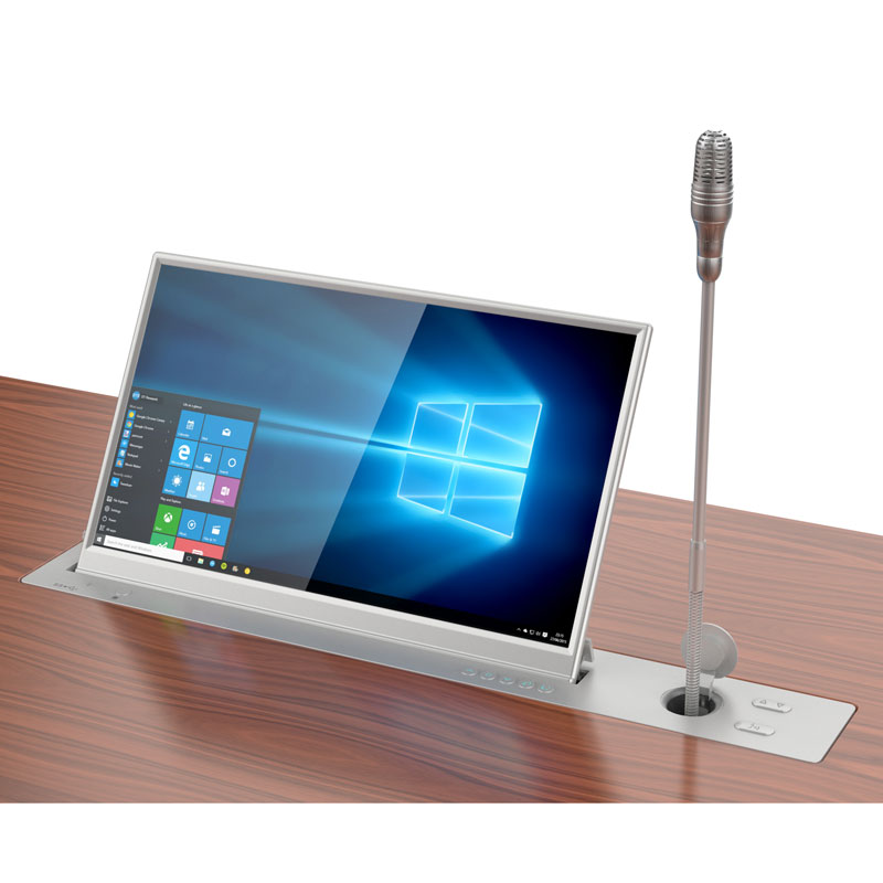 Тонкорамный моторизованный выдвижной монитор серии Forward Conference диагональю 15,6, имеет толщину всего 6,5 мм. Угол наклона монитора может быть отрегулирован в диапазоне от 0° до 30°. Цифровое табло диагональю 10,1" располагается на задней части основного монитора и может отображать такую информацию, как имя и должность делегата, логотип компании, тема конференции и пр.