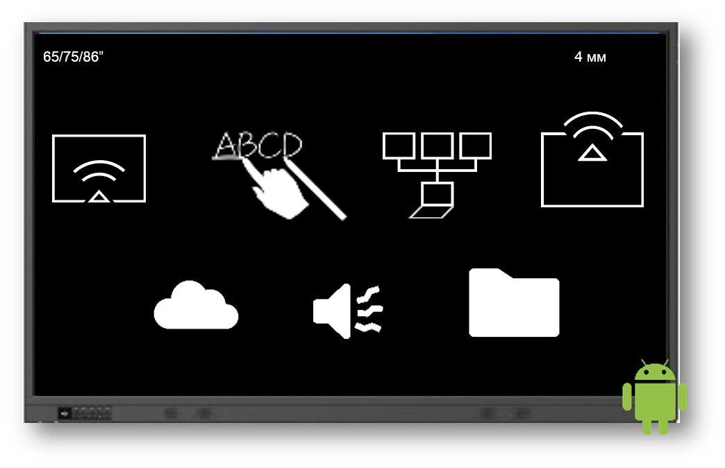 86",4K 60 Гц, распознавание объектов в Windows и Android (палец, маркер, кулак) без драйверов, сохранение в PowerPoint, Word (Office 365), Excel (Office 365), PDF, MS Whiteboard, MS OneNote без драйверов, AirPlay, встроенный Android, кастомизируемый интерфейс, пробрасываемые USB |