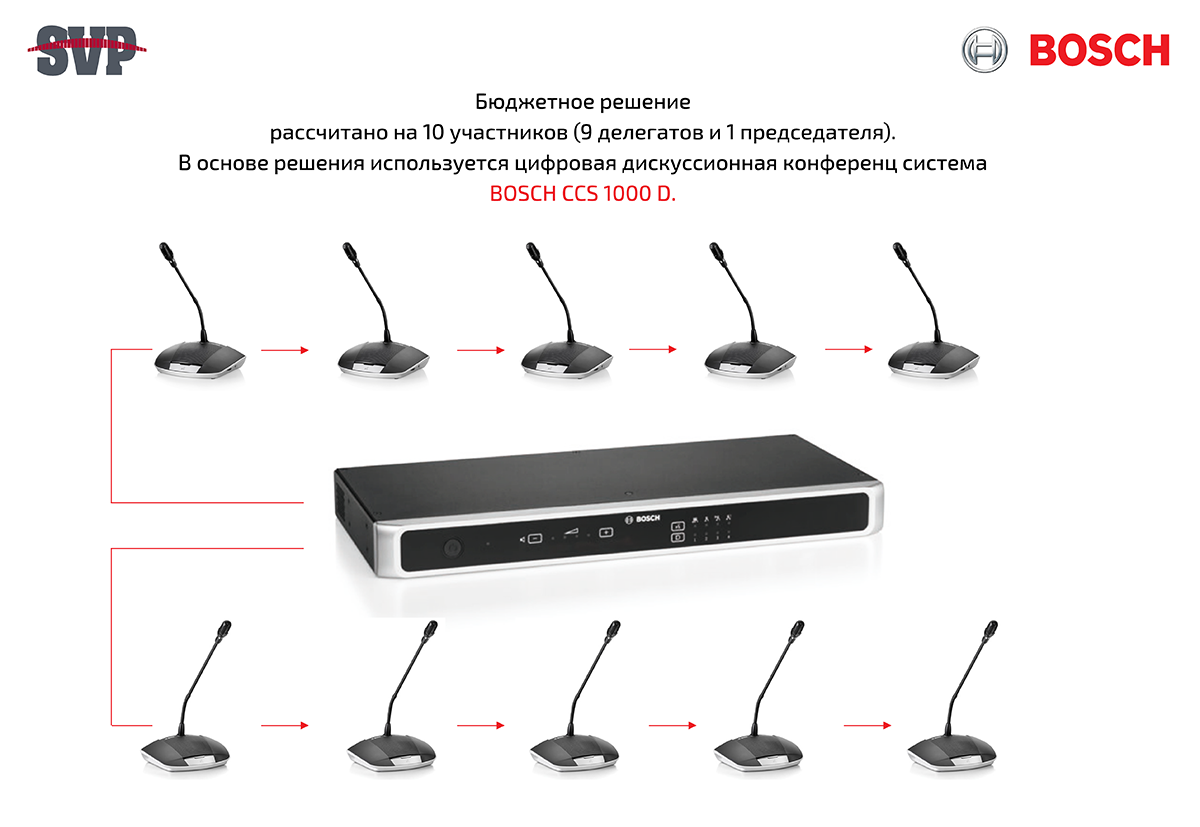 Решение рассчитано на 10 участников (9 делегатов и 1 председателя). В основе решения используется цифровая дискуссионная конференц система BOSCH CCS 1000 D.